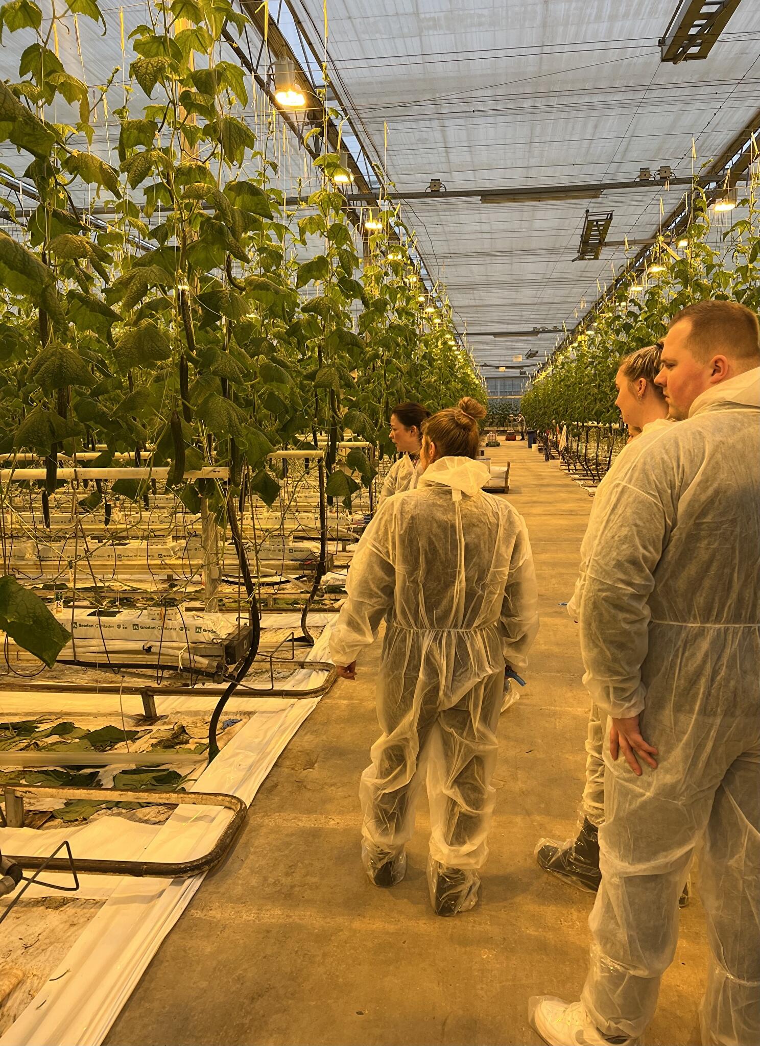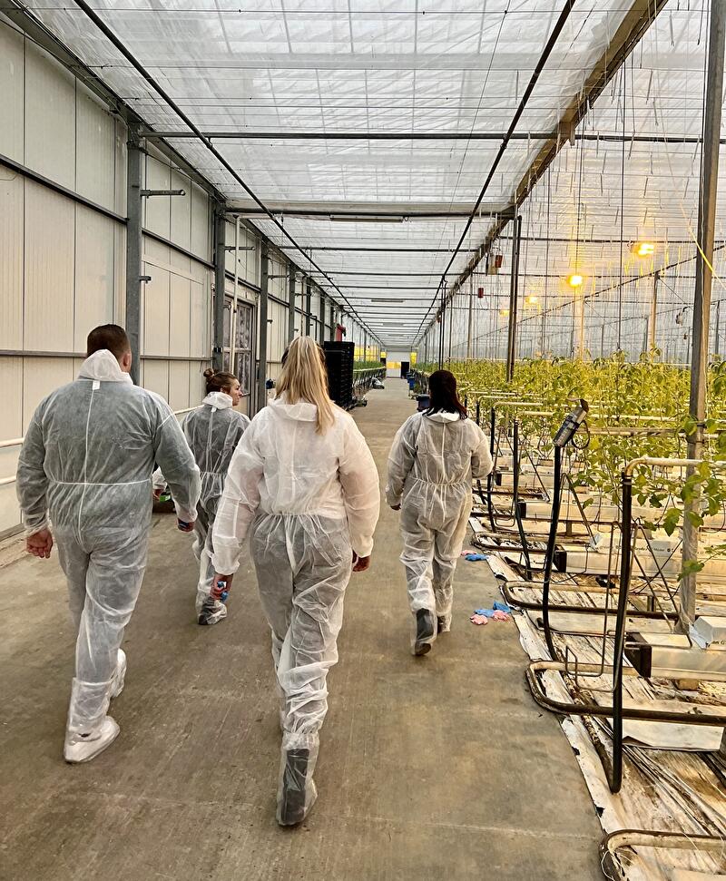 Bij aankomst werden we volgens de hygiënevoorschriften uitgerust met een overal, beschermhoezen voor de schoenen en een haarnetje. Daarna startte de rondleiding door de kassen, waar ons het teeltproces werd uitgelegd en waar we konden zien hoeveel handwerk er komt kijken bij de teelt van tomaten en komkommers. ๐ฅ๐